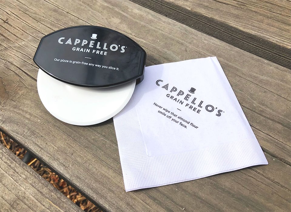 Pizza cutter created to promote Cappello’s grain free pizzas. Napkin used to serve with pizza samples at Cappello’s ExpoWest booth.