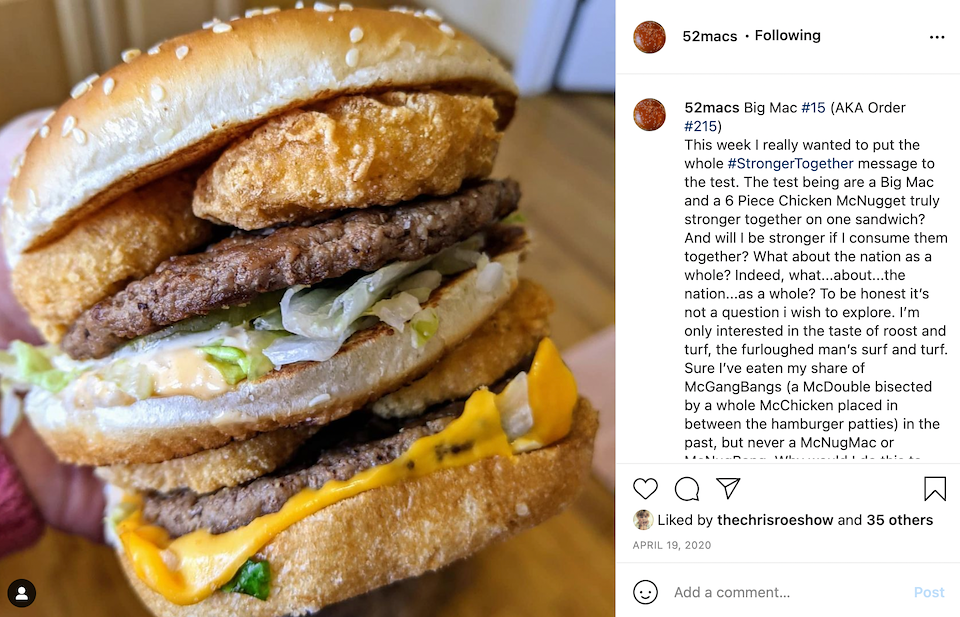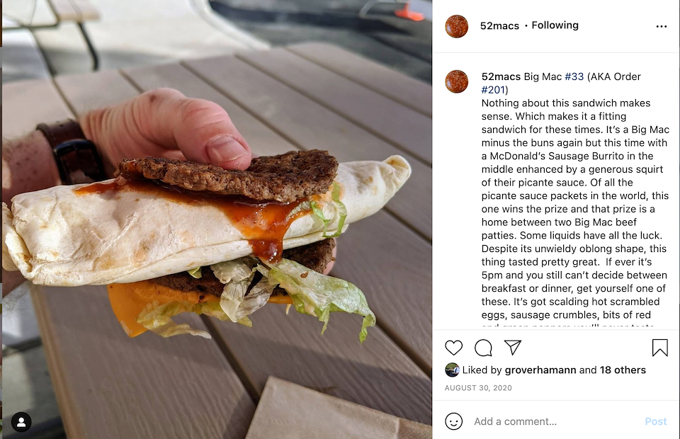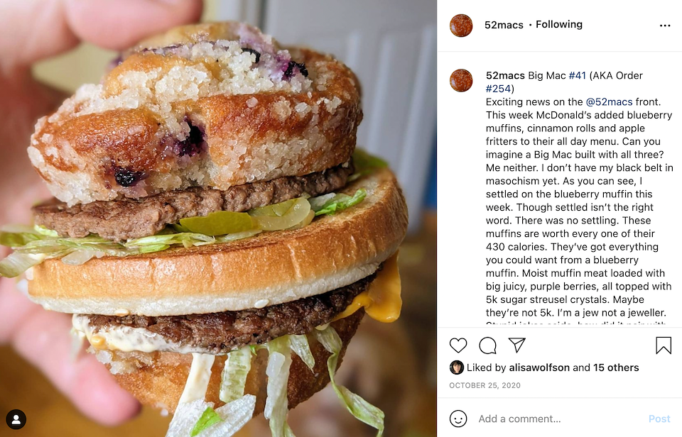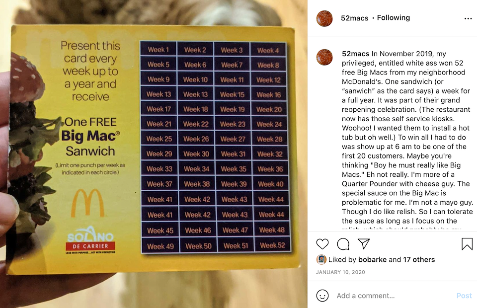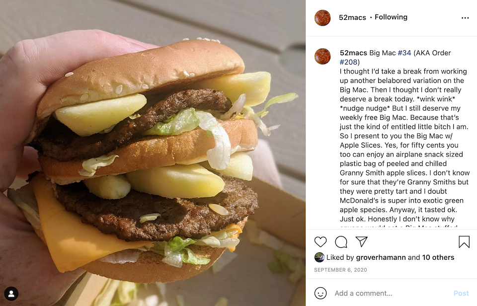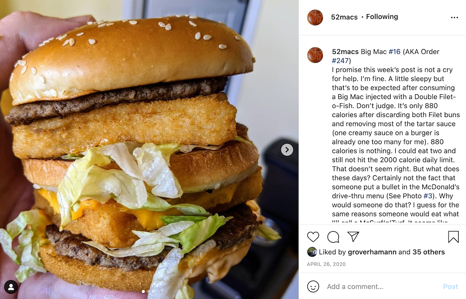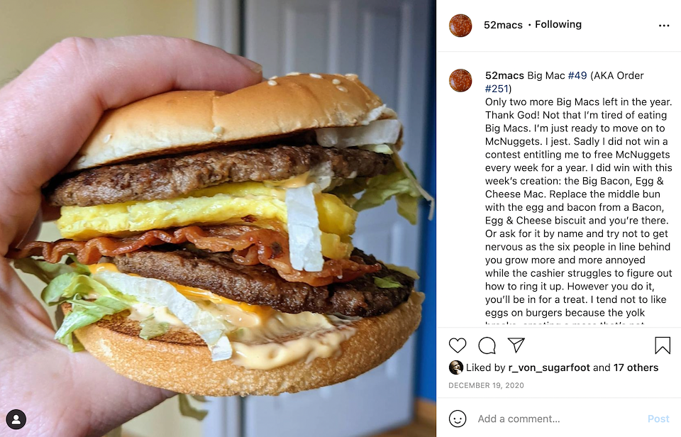 2020 was the year of the pandemic. It was also the year I ate a free Big Mac every week (thanks to a giveaway) and lost over 30 pounds (thanks to the LoseIt app). I documented my journey on Instagram. Because that’s what we do nowadays.